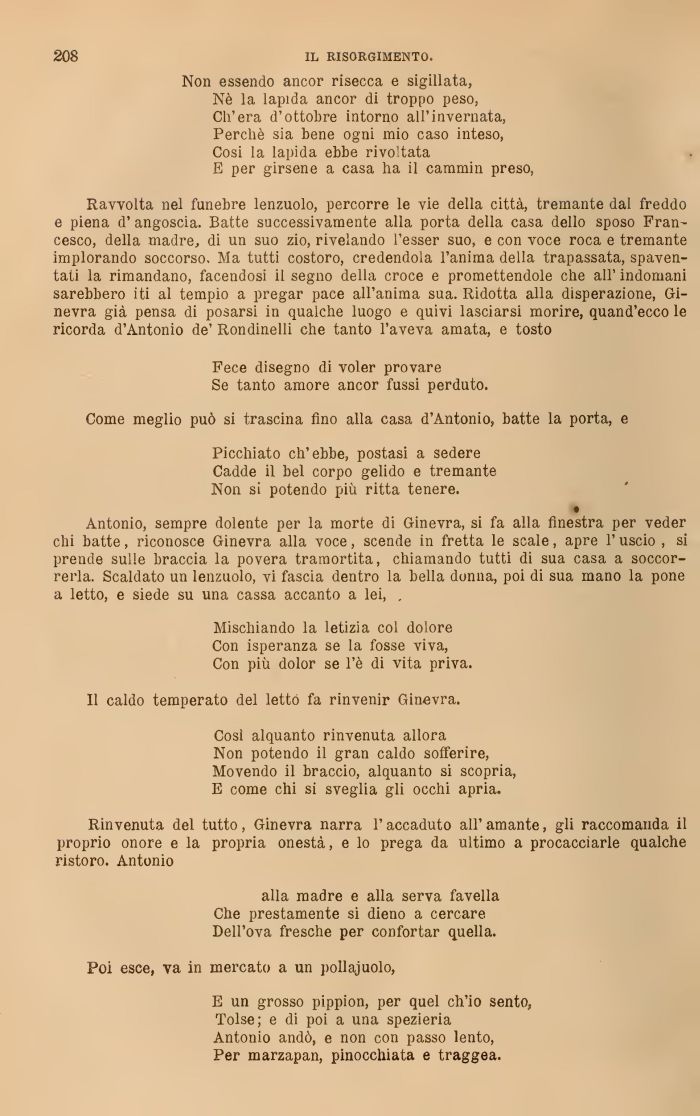 Ravvolta nel funebre lenzuolo, percorre le vie della città, tremante dal freddo e piena d' angoscia. Batte successivamente alla porta della casa dello sposo Fran-cescoj della madre, di un suo zio, rivelando l'esser suo, e con voce roca e tremante implorando soccorso. Ma tutti costoro, credendola l'anima della trapassata, spaventati la rimandano, facendosi il segno della croce e promettendole che all' indomani sarebbero iti al tempio a pregar pace all'anima sua. Ridotta alla disperazione, Ginevra già pensa di posarsi in qualche luogo e quivi lasciarsi morire, quand'ecco le ricorda d'Antonio de' Rondinelli che tanto l'aveva amata, e tosto