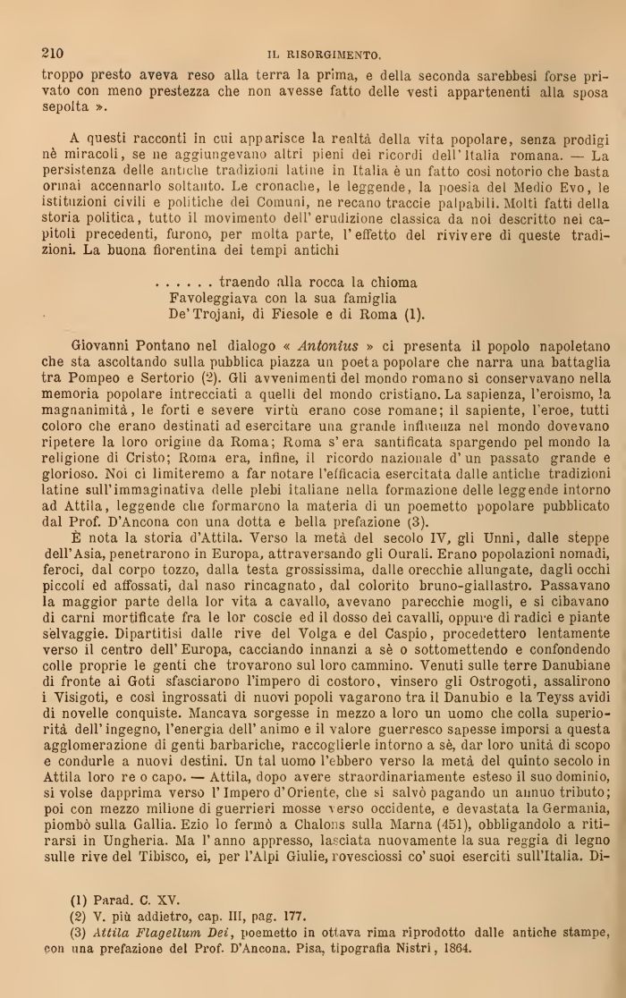 Giovanni Pontano nel dialogo « Antonius » ci presenta il popolo napoletano che sta ascoltando sulla pubblica piazza un poeta popolare che narra una battaglia tra Pompeo e Sertorio (2). Gli avvenimenti del mondo romano si conservavano nella memoria popolare intrecciati a quelli del mondo cristiano. La sapienza, l'eroismo, la magnanimità, le forti e severe virtù erano cose romane; il sapiente, l'eroe, tutti coloro che erano destinati ad esercitare una grande influenza nel mondo dovevano ripetere la loro origine da Roma; Roma s'era santificata spargendo pel mondo la religione di Cristo; Roma era, infine, il ricordo nazionale d'un passato grande e glorioso. Noi ci limiteremo a far notare l'efficacia esercitata dalle antiche tradiziori latine sull'immaginativa delle plebi italiane nella formazione delle leggende intorno ad Attila, leggende che formarono la materia di un poemetto popolare pubblicato dal Prof. D'Ancona con una dotta e bella prefazione (3).