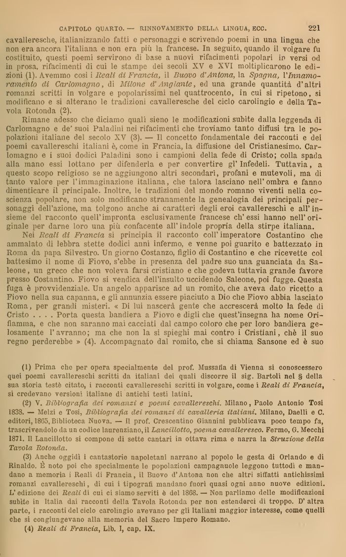 (3) Anche oggidì i cantastorie napoletani narrano al popolo le gesta di Orlando e di Rinaldo. E noto poi che specialmente le popolazioni campagnuole leggono tuttodì e mandano a memoria i Reali di Francia, il Buovo d'Antona non che altri siffatti antichissimi romanzi cavallereschi, di cui i tipografi mandano fuori quasi ogni anno nuove edizioni. L' edizione dei Reali di cui ci siamo serviti è del 1863. — Non parliamo delle modificazioni subite in Italia dai racconti della Tavola Rotonda per non estenderci di troppo. D' altra parte, i racconti del ciclo carolingio avevano per gli Italiani maggior interesse, come quelli che si congiungevano alla memoria del Sacro Impero Romano.