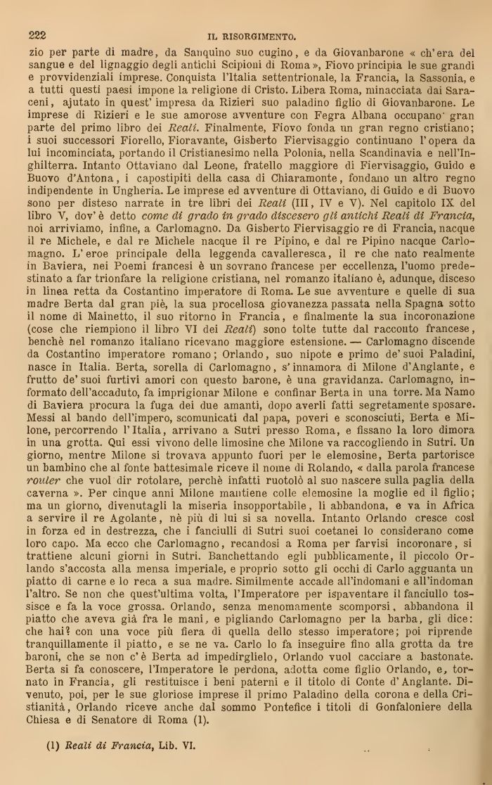 zio per parte di madre, da Sariquino suo cugino, e da Giovanbarone « ch'era del sangue e del lignaggio degli antichi Scipioni di Roma», Fiovo principia le sue grandi e provvidenziali imprese. Conquista l'Italia settentrionale, la Francia, la Sassonia, e a tutti questi paesi impone la religione di Cristo. Libera Roma, minacciata dai Saraceni, ajutato in quest'impresa da R.zieri suo paladino figlio di Giovanbarone. Le imprese di Kizier1' e le sue amorose avventure con Fegra Albana occupano' gran parte del primo libro dei Reali. Finalmente, Fiovo fonda un gran regno cristiano; i suoi successori Fiorello, Fioravante, Gisberto Fiervisaggio continuano l'opera da lui incominciata, portando il Cristianesimo nella Poionia, nella Scandinavia e nell'Inghilterra. Intanto Ottaviano dal Leone, fratello maggiore di Fiervisaggio, Guido e Buovo d'Antona, i capostipiti della casa di Chiaramente, fondano un altro regno indipendente in Ungheria. Le imprese ed avventure di Ottaviano, di Guido e di Buovo sono per disteso narrate in tre libri dei Reali (III, IV e V). Nel capitolo IX del libro V, dov' è detto come di grado in grado discesero gli antichi Reali di Francia, noi arriviamo, infine, a Carlomagno. Da Gisberto Fiervisaggio re di Francia, nacque il re Michele, e dal re Michele nacque il re Pipino, e dal re Pipino nacque Carlo-magno. L'eroe principale della leggenda cavalleresca, il re che nato realmente in Baviera, nei Poemi francesi è un sovrano francese per eccellenza, l'uomo predestinato a far trionfare la religione cristiana, nel romanzo italiano è, adunque, disceso in linea retta da Costantino imperatore di Roma. Le sue avventure e quelle di 3ua madre Berta dal gran piè, la sua procellosa giovanezza passata nella Spagna sotto il nome di Mainetto, il suo ritorno in Francia, e finalmente la sua incoronazione (cose che riempiono il libro VI dei Reali) sono tolte tutte dal racconto francese, benché nel romanzo italiano ricevano maggiore estensione. — Carlomagno discende da Costantino imperatore romano ; Orlando, suo nipote e primo de' suoi Paladini, nasce in Italia. Berta, sorella di Carlomagno, s'innamora di Milone d'Anglante, e frutto de' suoi furtivi amori con questo barone, è una gravidanza. Carlomagno, informato dell'accaduto, fa imprigionar Milone e confinar Berta in una torre. Ma Namo di Baviera procura la fuga dei due amanti, dopo averli fatti segretamente sposare. Messi al bando dell'impero, scomunicati dal papa, poveri e sconosciuti, Berta e Milone, percorrendo l'Italia, arrivano a Sutri presso Roma, e fissano la loro dimora in una grotta. Qui essi vivono delle limosine che Milone va raccogliendo in Sutri. Un giorno, mentre Milone si trovava appunto fuori per le elemosine, Berta partorisce un bambino che al fonte battesimale riceve il nome di Rolando, « dalla parola francese rouler che vuol dir rotolare, perchè infatti ruotolò al suo nascere sulla paglia della caverna ». Per cinque anni Milone mantiene colle elemosine la moglie ed il figlio; ma un giorno, divenutagli la miseria insopportabile, li abbandona, e va in Africa a servire il re Agolante, nè più di lui si sa novella. Intanto Orlando cresce così in forza ed in destrezza, che i fanciulli di Sutri suoi coetanei lo considerano come loro capo. Ma ecco che Carlomagno, recandosi a Roma per farvisi incoronare, si trattiene alcuni giorni in Sutri. Banchettando egli pubblicamente, il piccolo Orlando s'accosta alla mensa imperiale, e proprio sotto gli occhi eli Carlo agguanta un piatto di carne e lo reca a sua madre. Similmente accade all'indomani e all'indoman l'altro. Se non che quest'ultima volta, l'Imperatore per ispaventare il fanciullo tossisce e fa la voce grossa. Orlando, senza menomamente scomporsi, abbandona il piatto che aveva già fra le mani, e pigliando Carlomagno per la barba, gli dice: che hai? con una voce più fiera di quella dello stesso imperatore; poi riprende tranquillamente il piatto, e se ne va. Carlo lo fa inseguire fino alla grotta da tre baroni, che se non c'è Berta ad impedirglielo, Orlando vuol cacciare a bastonate. Berta si fa conos