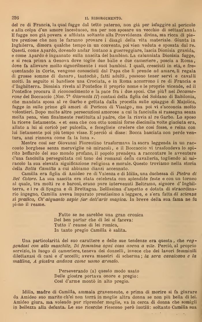 Mentre così ser Giovanni Fiorentino trasformava la sacra leggenda n un racconto borghese senza meraviglie nò miracoli, e il Boccaccio vi trasfondeva lo sparito beffardo del suo mondo profano, il popolo prendeva a raccontare le avventure d'una fanciulla perseguitata col tono dei romanzi della cavalleria, togliendo al miracolo la sua elevata significazione religiosa e morale. Questo troviamo nella storia della Bella Camilla a cui abbiamo dianzi accennato.