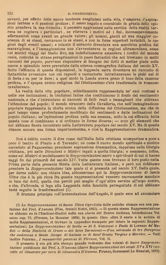 Non è debito nostro il dire come dall'Italia fatta cristiana scompai isse a poco a poco il teatro di Plauto e di Terenzio; nè come il nuovo mondo spirituale e mistico succeduto al Paganesimo prendesse espressione drammatica, dapprima nella liturgìa cristiana, poi nelle Divozioni o Misteri legati a quella liturgia; e nemmeno, infine, come sui Misteri si modellassero le Rappresentazioni sacre o spirituali di cui si hanno saggi fin dai primordi del secolo XIV. Tutte queste cose trovano il loro posto nella Prima parte della presente Storia della Letteratura italiana, e però noi dobbiamo prendere la Rappresentazione tale quale ci si presenta nel secolo XV. Della quale, per darne subito una chiara idea, abbozzeremo qui la Rappresentazione di Santa Uliva che è la più ricca fra quante rappresentazioni vennero nuovamente mandate in luce dai dotti, quella che perciò può meglio d'ogn'altra serv re all'uopo nostro, e che, d'altronde, si lega alla Leggenda della fant'ulla perseguitata di cui abbiamo testé seguite le trasformazioni (1).