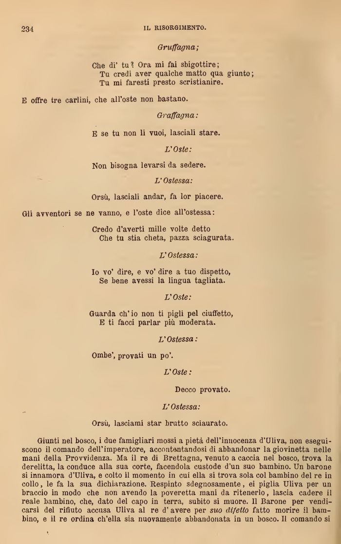 Giunti nel bosco, i due famigliari mossi a pietą dell' nnocenza d'Uliva, non eseguiscono il comando dell'imperatore, accontentandosi di abbandonar la giovinetta nelle mani della Provvidenza. Ma il re di Brettagna, venuto a cacci,i nel bosco, trova la derelitta, la conduce alla sua corte, facendola custode d'un suo bambino. Un barone si innamora d'Uliva, e colto il momento in cui ella si trova sola col bambino del re in collo, le fa la sua dichiarazione. Respinto sdegnosamente, ei piglia Uliva per un braccio in modo che non avendo la poveretta mani da ritenerlo, lascia cadere il reale bambino, che, dato del capo in terra, subito si muore. Il Barone per vendicarsi del rifiuto accusa Uliva al re d' avere per suo difetto fatto morire il bambino, e il re ordina ch'ella sia nuovamente abbandonata in un bosco. Il comando si