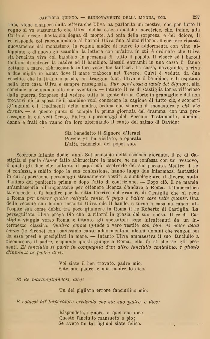rata, viene a sapere dalla lettera che Uliva ha partorito un mostro, che per tutto il regno si va sussurando che Uliva debba essere qualche meretrice, che, infine, alla Corte si crede ch'ella sia degna di morte. Ad onta della sorpresa e del dolore, il re risponde col raccomandare ai baroni Uliva fino al suo ritorno. Il corriere ripassa nuovamente dal monastero, la regina madre di nuovo lo addormenta con vino alloppiato, e di nuovo gli scambia la lettera con un'altra in cui è ordinato che Uliva sia bruciata viva col bambino in presenza di tutto il popolo. Il viceré ed i baroni tentano di salvare la madre ed il bambino. Messili entrambi in una cassa li fanno gettare a mare, abbracciando in loro vece due fantocci. La cassa, navigando, arriva a due miglia in Roma dove il mare trabocca nel Tevere. Quiv* è veduta da due vecchie, che la tirano a prodo, ne traggon fuor Uliva e il bambino, e li ospitano nella loro casa. Uliva è sempre rassegnata. Pur ogni cosa a laude del Signore, ella conclude accennando alle sue sventure. — Intanto il re di Castiglia torna vittorioso dalla guerra. Sorpreso dal vedere tutta la gente di sua Corte in gramaglie e dal non trovarvi nè la sposa nè il bambino vuol conoscere la cagione di tutto ciò, e scoperti gl'inganni e i tradimenti della madre, ordina che si arda il monastero e cM v'è drento. — A questo punto si compie la puma giornata del dramma con una processione in cui vedi Cristo, Pietro, i personaggi del Vecchio Testamento, uomini, donne e frati che vanno fra loro alternando il canto del salmo di Davide: