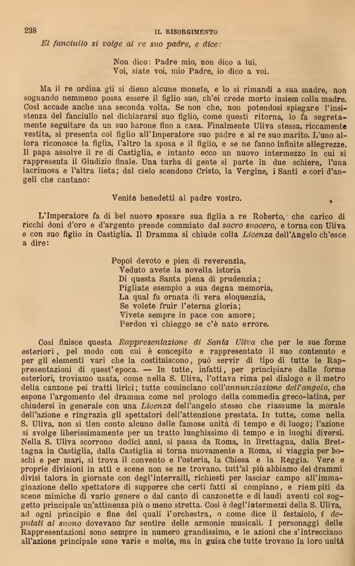 Così finisce questa Rappresentazione di Santa Uliva che per le sue forme esteriori , pel modo con cui è concepito e rappresentato il suo contenuto e per gli elementi vari che la costituiscono, può servir di tipo di tutte le Rappresentazioni di quest'epoca. — In tutte, infatti, per principiare dalle forme esteriori, troviamo usata, come nella S. Uliva, l'ottava rima pel dialogo e il metro delia canzone pei tratti lirici ; tutte cominciano coWannunziazione dell'angelo, che espone l'argomento del dramma come nel prologo della commedia greco-latina, per chiudersi in generale con una Licenza dell'angelo stesso che riassume la morale dell'azione e ringrazia gli spettatori dell'attenzione prestata. In tutte, come nella S. Uliva, non si tien conto alcuno delJe famose unità di tempo e di luogo; l'azione si svolge liberissimamente per un tratto lunghissimo di tempo e in luoghi diversi. Nella S. Uliva scorrono dodici anni, si passa da Roma, in Brettagna, dalia Brettagna in Castiglia, dalla Castiglia si torna nuovamente a Roma, si vi tggia per boschi e per mari, si trova il convento e l'osteria, la Chiesa e la Reggia. Vere e proprie divisioni in atti e scene non se ne trovano, tutt'al più abbiamo dei drammi divisi talora in giornate con degl'intervalli, richiesti per lasciar campo all'immaginazione dello spettatore di supporre che certi fatti si compiano, e rampiti da scene mimiche di vario genere o dal canto di canzonette e di laudi aventi col soggetto principale un'attinenza più o meno stretta Così è degl'intermezzi della S, Uliva, ad ogni principio e fine dei quali l'orchestra, o come dice il festaiolo, i deputati al suono dovevano far sentire delle armonie musicali. I personaggi delle Rappresentazioni sono sempre in numero grandissimo, e le azioni che s'intrecciano all'azione principale sono varie e molte., ma in guisa che tutte troiano la loro un tà