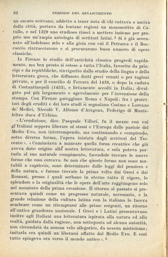 « L'erudizione, dice. Pasquale Villari, fu il mezzo con cui gl'Italiani seppero liberare sé stessi e l'Europa dalle pastoie del Medio Evo, non interrompendo, ma continuando e compiendo, sotto diversa forma, l'opera iniziata dagli scrittori del Trecento ». « Cominciava a mancare quella forza creatrice che già aveva dato origine alla nostra letteratura, e sola poteva portarla al suo naturale compimento, facendole trovare le nuove forme che essa cercava. Se non che queste forme non sono mutabili a capriccio, sono determinate dalle leggi del pensiero e della natura, e furono trovate la prima volta dai Greci e dai Romani, presso i quali serbano in eterno tutto il vigore, lo splendore e la originalità che le opere dell'arte raggiungono solo nel momento della prima creazione. Il ritorno al passato si presentava quindi come un progresso naturale, necessario, e la grande relazione della cultura latina con la italiana lo faceva sembrare come un ritemprarsi alle prime sorgenti, un ritorno all'antica grandezza nazionale. I Greci e i Latini presentavano inoltre agli Italiani una letteratura ispirata alla natura ed alla realtà, guidata dalla ragione, non sottoposta ad alcuna autorità, non circondata da nessun velo allegorico, da nessun misticismo; imitarla era quindi un liberarsi affatto dal Medio Evo. E così tutto spingeva ora verso il mondo antico ». 3
