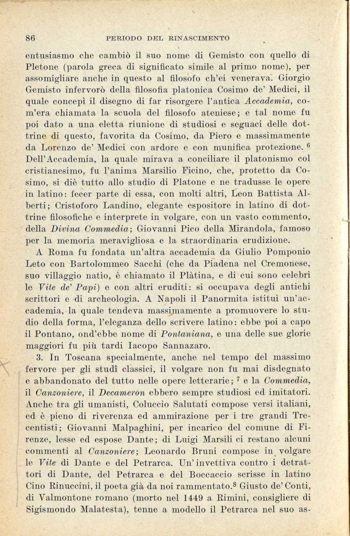 entusiasmo ohe cambiò il suo nome di Gemisto con quello di Pletone (parola greca di significato simile al primo nome), per assomigliare anche in questo al filosofo ch'ei venerava, Giorgio Gemisto infervorò della filosofia platonica Cosimo de' Medici, il quale concepì il disegno di far risorgere l'antica Accademia, com'era chiamata la scuola del filosofo ateniese; e tal nome fu poi dato a una eletta riunione di studiosi e seguaci delle dottrine di questo, favorita da Cosimo, da Piero e massimamente da Lorenzo de' Medici con ardore e con munifica protezione. 6 Dell'Accademia, la quale mirava a conciliare il platonismo col cristianesimo, fu l'anima Marsilio Ficino, che, protetto da Cosimo, si diè tutto allo studio di Platone e ne tradusse le opere in latino : fecer parte di essa, con molti altri, Leon Battista Alberti; Cristoforo Landino, elegante espositore in latino di dottrine filosofiche e interprete in volgare, con un vasto commento, della Divina Commedia; Giovanni Pico della Mirandola, famoso per la memoria meravigliosa e la straordinaria erudizione.