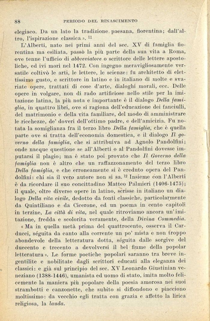 L'Alberti, nato nei primi anni del sec. XV di famiglia fiorentina ma esiliata, passò la più parte della sua vita a Roma, ove tenne l'ufficio di abbreviatore o scrittore delle lettere apostoliche, ed ivi morì nel 1472. Con ingegno meravigliosamente versatile coltivò le arti, le lettere, le scienze: fu architetto di elettissimo gusto, e scrittore in latino e in italiano di molte e svariate opere, trattati di cose d'arte, dialoghi morali, ecc. Delle opere in volgare, non di rado artificiose nello stile per la imitazione latina, la più nota e importante è il dialogo Della famiglia, in quattro libri, ove si ragiona dell'educazione dei fanciulli, del matrimonio e della vita familiare, del modo di amministrare le ricchezze, de' doveri dell'ottimo padre, e dell'amicizia. Fu notata la somiglianza fra il terzo libro Della famiglia, che è quella parte ove si tratta dell'economia domestica, e il dialogo II governo della famiglia, che si attribuiva ad Agnolo Pandolfini; onde nacque questione se all'Alberti o al Pandolfini dovesse imputarsi il plagio ; ma è stato poi provato che II Governo della famiglia non è altro che un raffazzonamento del terzo libro Della famiglia, e che erroneamente si è creduto opera del Pandolfini: chi sia il vero autore non si sa.13 Insieme con l'Alberti è da ricordare il suo concittadino Matteo Palmieri (1406-1475); il quale, oltre diverse opere in latino, scrisse in italiano un dialogo Della vita civile, dedotto da fonti classiche, particolarmente da Quintiliano e da Cicerone, ed un poema in cento capitoli in terzine, La città di vita, nel quale ritroviamo ancora un' imitazione, fredda e scolorita veramente, della Divina Commedia.