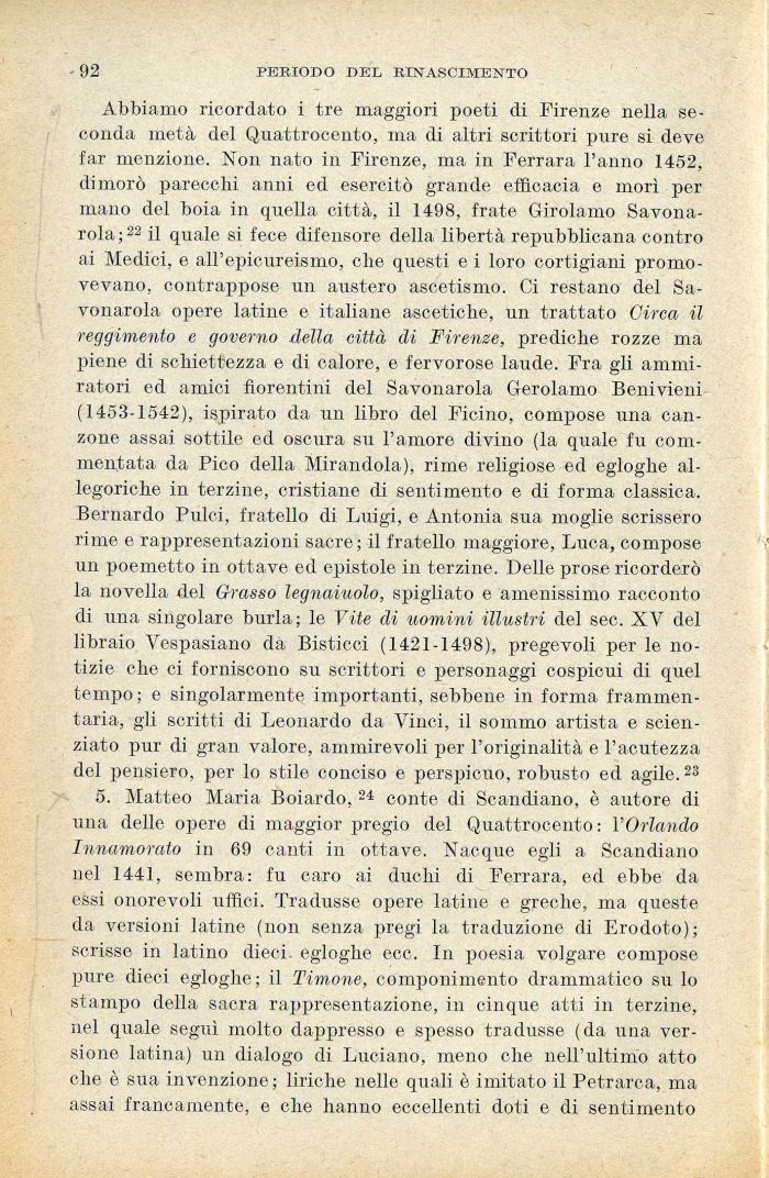 Abbiamo ricordato i tre maggiori poeti di Firenze nella seconda metà del Quattrocento, ma di altri scrittori pure si deve far menzione. Non nato in Firenze, ma in Ferrara l'anno 1452, dimorò parecchi anni ed esercitò grande efficacia e morì per mano del boia in quella città, il 1498, frate Girolamo Savonarola ;22 il quale si fece difensore della libertà repubblicana contro ai Medici, e all'epicureismo, che questi e i loro cortigiani promovevano, contrappose un austero ascetismo. Ci restano del Savonarola opere latine e italiane ascetiche, un trattato Circa il reggimento e governo della città di Firenze, prediche rozze ma piene di schiettezza e di calore, e fervorose laude. Fra gli ammiratori ed amici fiorentini del Savonarola Gerolamo Benivieni-(1453-1542), ispirato da un libro del Ficino, compose una canzone assai sottile ed oscura su l'amore divino (la quale fu commentata da Pico della Mirandola), rime religiose ed egloghe allegoriche in terzine, cristiane di sentimento e di forma classica. Bernardo Pulci, fratello di Luigi, e Antonia sua moglie scrissero rime e rappresentazioni sacre; il fratello maggiore, Luca, compose un poemetto in ottave ed epistole in terzine. Delle prose ricorderò la novella del Crasso legnaiuolo, spigliato e amenissimo racconto di una singolare burla; le Vite di uomini illustri del sec. XV del libraio Vespasiano dà Bisticci (1421-1498), pregevoli per le notizie che ci forniscono su scrittori e personaggi cospicui di quel tempo ; e singolarmente importanti, sebbene in forma frammentaria, gli scritti di Leonardo da Vinci, il sommo artista e scienziato pur di gran valore, ammirevoli per l'originalità e l'acutezza del pensiero, per lo stile conciso e perspicuo, robusto ed agile.23 5. Matteo Maria Boiardo, 24 conte di Scandiano, è autore di una delle opere di maggior pregio del Quattrocento : l'Orlando Innamorato in 69 canti in ottave. Nacque egli a Scandiano nel 1441, sembra: fu caro ai duchi di Ferrara, ed ebbe da essi onorevoli uffici. Tradusse opere latine e greche, ma queste da versioni latine (non senza pregi la traduzione di Erodoto); scrisse in latino dieci, egloghe ecc. In poesia volgare compose pure dieci egloghe ; il Timone, componimento drammatico su lo stampo della sacra rappresentazione, in cinque atti in terzine, nel quale seguì molto dappresso e spesso tradusse (da una versione latina) un dialogo di Luciano, meno che nell'ultimo atto che è sua invenzione; liriche nelle quali è imitato il Petrarca, ma assai francamente, e che hanno eccellenti doti e di sentimento