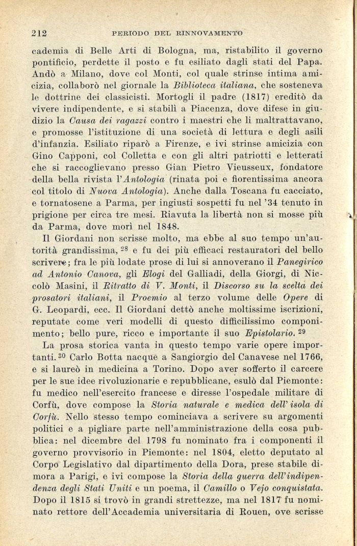 La prosa storica vanta in questo tempo varie opere importanti.30 Carlo Botta nacque a Sangiorgio del Canavese nel 1766, e si laureò in medicina a Torino. Dopo aver sofferto il carcere per le sue idee rivoluzionarie e repubblicane, esulò dal Piemonte: fu medico nell'esercito francese e diresse l'ospedale militare di Corfù, dove compose la Storia naturale e medica dell' isola di Corfù. Nello stesso tempo cominciava a scrivere su argomenti politici e a pigliare parte nell'amministrazione della cosa pubblica: nel dicembre del 1798 fu nominato fra i componenti il governo provvisorio in Piemonte: nel 1804, eletto deputato al Corpo Legislativo dal dipartimento della Dora, prese stabile dimora a Parigi, e ivi compose la Storia della guerra dell'indipendenza degli Stati Uniti e un poema, il Camillo o Vejo conquistata. Dopo il 1815 si trovò in grandi strettezze, ma nel 1817' fu nominato rettore dell'Accademia universitaria di Rouen, ove scrisse