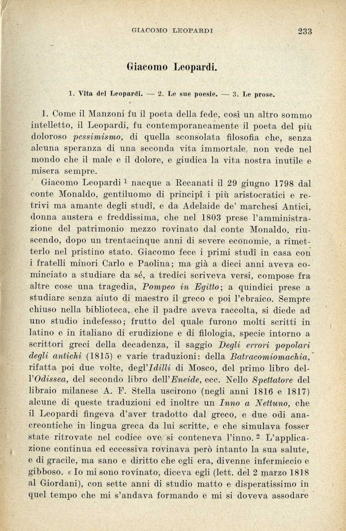 1. Come il Manzoni fu il poeta della fede, così un altro sommo intelletto, il Leopardi, fu contemporaneamente il poeta del più doloroso pessimismo, di quella sconsolata filosofìa che, senza alcuna speranza di una seconda vita immortale, non vede nel mondo che il male e il dolore, e giudica la vita nostra inutile e misera sempre.