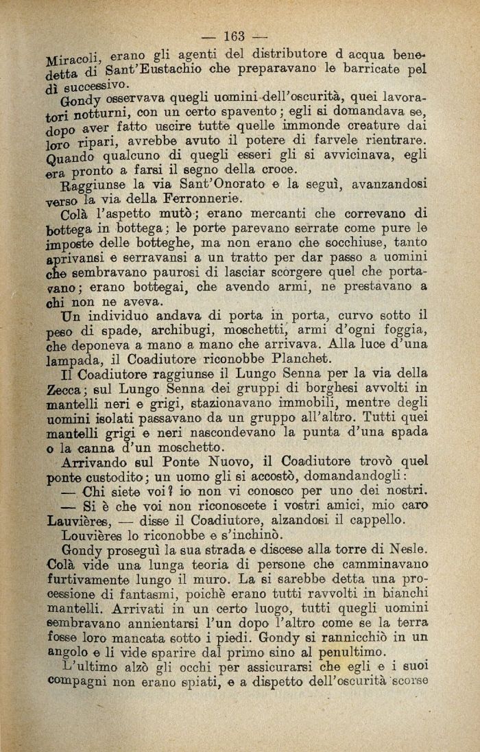 Il Coadiutore raggiunse il Lungo Senna per la via della Zecca; sul Lungo Senna dei gruppi di borghesi avvolti in mantelli neri e grigi, stazionavano immobili, mentre degli uomini isolati passavano da un gruppo all'altro. Tutti quei mantelli grigi e neri nascondevano la punta d'una spada o la canna d'un moschetto.